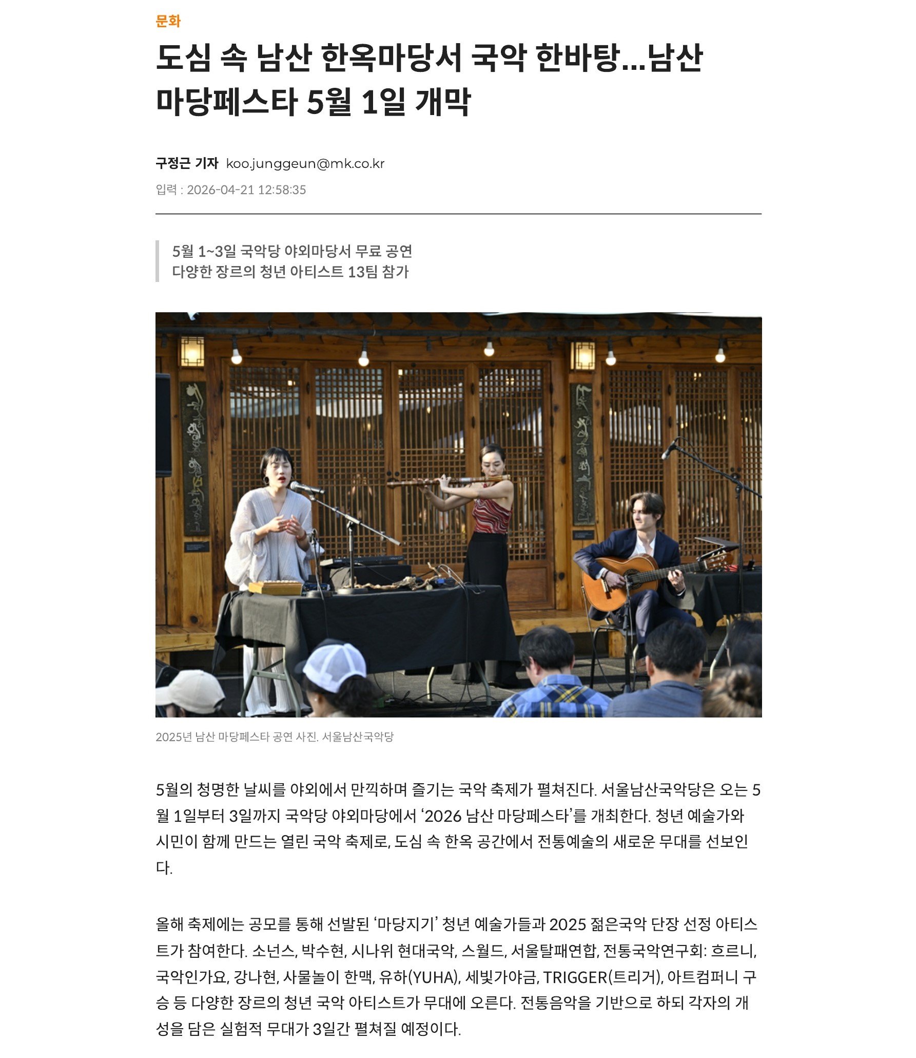 도심 속 남산 한옥마당서 국악 한바탕...남산 마당페스타 5월 1일 개막